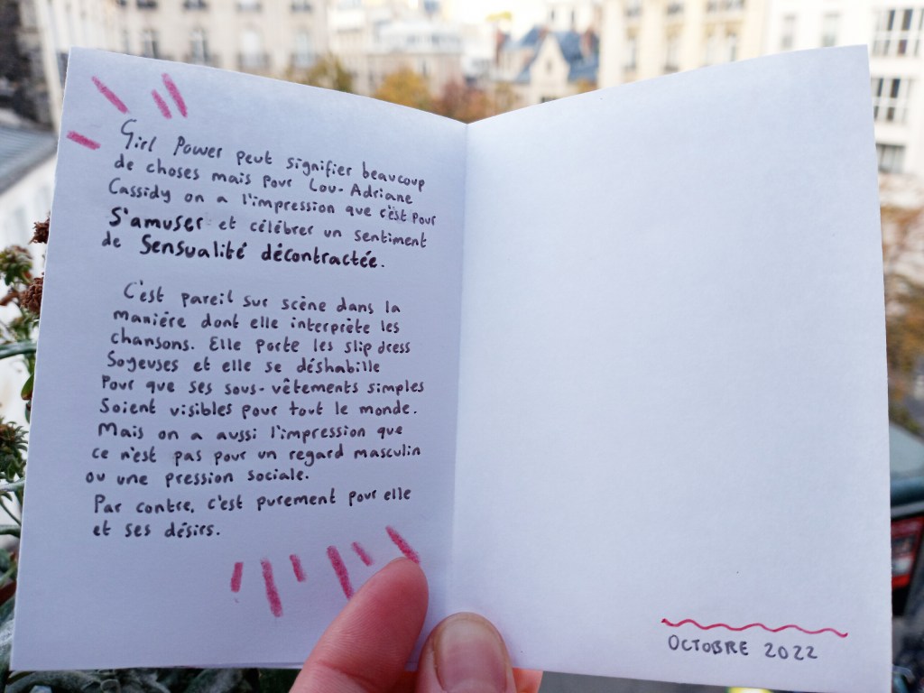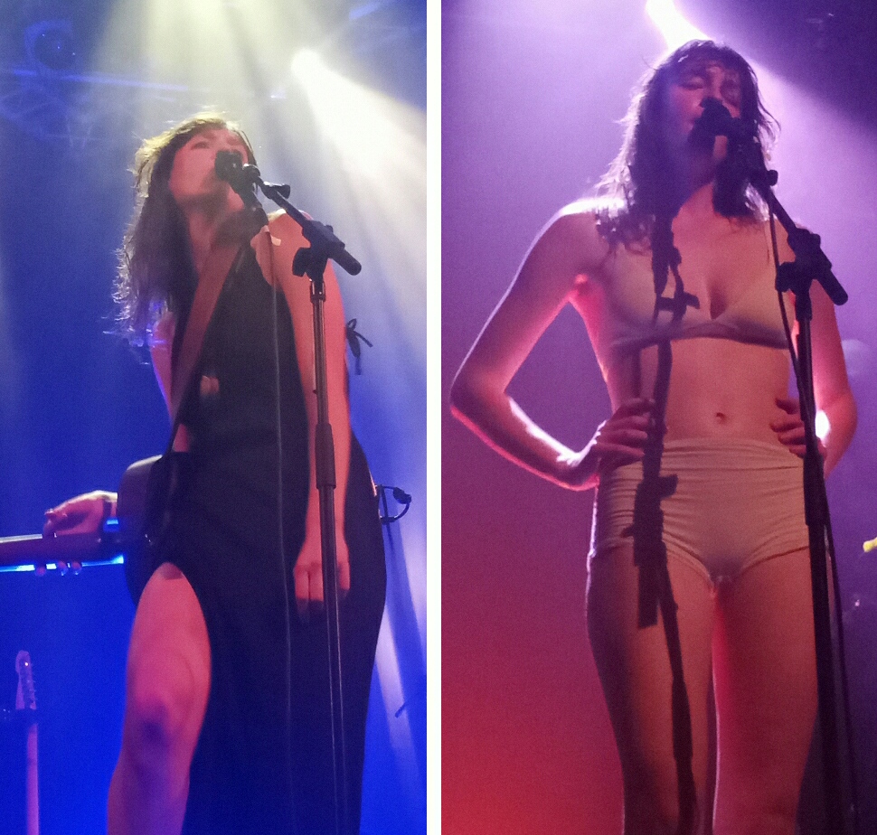 Aux Trois Baudets le premier soir (mercredi 12 octobre), le gang du Québec était present pour un petit spectacle: Lou-Adriane Cassidy avec ses musiciens Alexandre Martel, Thierry Larose, Vincent Gagnon et P-E Beaudoin. La salle n’était pas pleine, il y avait beaucoup des places libres (à ce lieu on s’assoit) mais c’était toujours une occasion pour relâcher les émotions, criant parfois dans le micro ou faisant les mouvements un peu sensuels. «Oh wow» a dit la personne derrière moi avec surprise quand les lumières étaient baissées et elle a enlevé sa robe pour être dans ses sous-vêtements. «Ah oui, je me pensais en réponse. C’est le norm.»