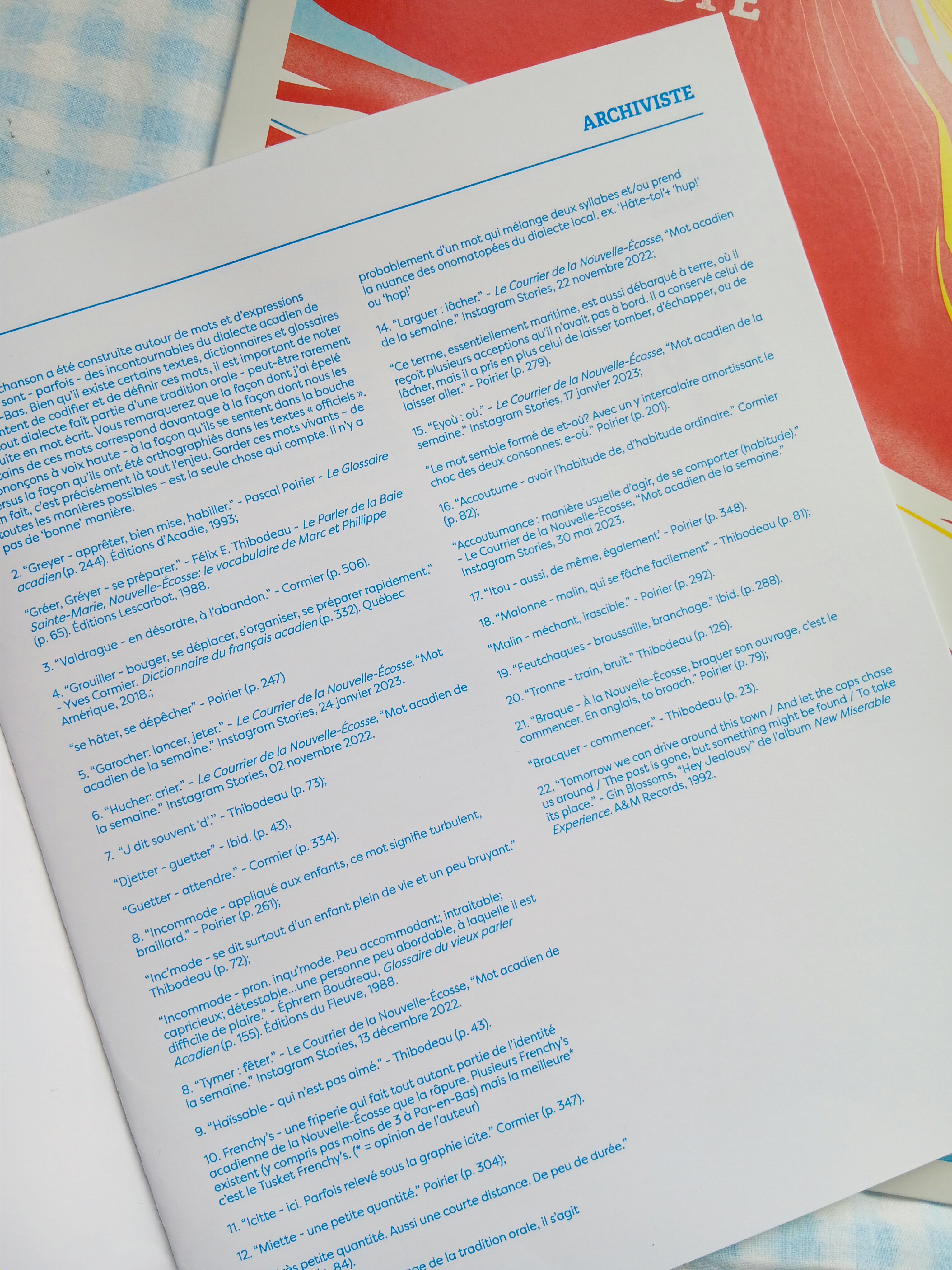 Il y a aussi hucher (crier), guetter (attendre), tymer (fêter) et haïssable (quelqu’un ou quelque chose qui n’est pas aimé). Frenchy’s est une chaîne de friperies bien connue en Nouvelle-Écosse, «mais la meilleure c’est le Tusket Frenchy’s» annonce Trevor dans les annotations.
