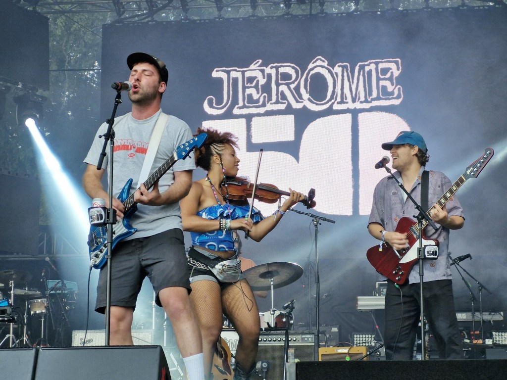 «Le Québec, un pays!», la foule a répété après que Jérôme a quitté la scène, en faisant référence à la chanson Antigéographiquement de son dernier album. Il a commencé son spectacle avec Le king de la consommation, une chanson inédite. Parlant de la consommation des cigarettes, de la bière et des champignons, avec un refrain ludique qui devient de plus en plus rapide, c’était une introduction idéale pour amuser la foule. Les chansons telles que Les ramasseux d’canettes et Lit Double, du dernier album, ainsi que Chaise musicale, de l’album La hiérarchill, ont apporté encore des moments de fun, toutes faisant partie du mélange de genres associé à Jérôme 50. L i l a a rejoint la scène pour la douceur de Le bac des objets perdus alors qu’une autre chanson inédite (sur la plus belle fille dans un moshpit au show de Québec Redneck Bluegrass Project) a encouragé la foule à construire un mini moshpit devant la scène.