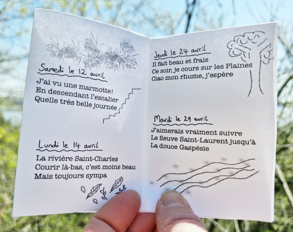 Ça fait du bien maintenant que le printemps est arrivé. Je peux courir où je veux, quand je veux, à la vitesse que je veux, sans être limitée par la maudite glace et le slush. Quand je cours, j’écoute rarement de la musique. C’est donc un moment très libérateur pour mon corps et ma tête, où mes pensées sont également libres d’errer où elles veulent.